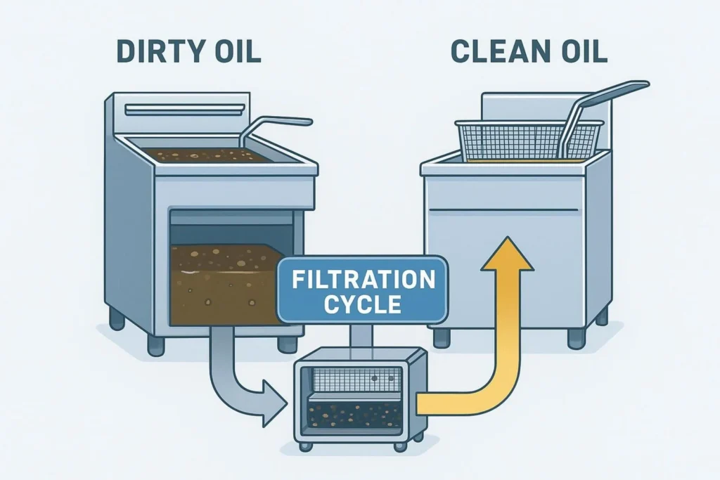 Oil is one of the biggest ongoing costs in a kitchen. Built-in filtration lets staff filter oil several times a day with a button push. Removing food bits and burnt particles often lets you stretch oil life by up to 50%, saving a lot of money each year and keeping flavors clean.