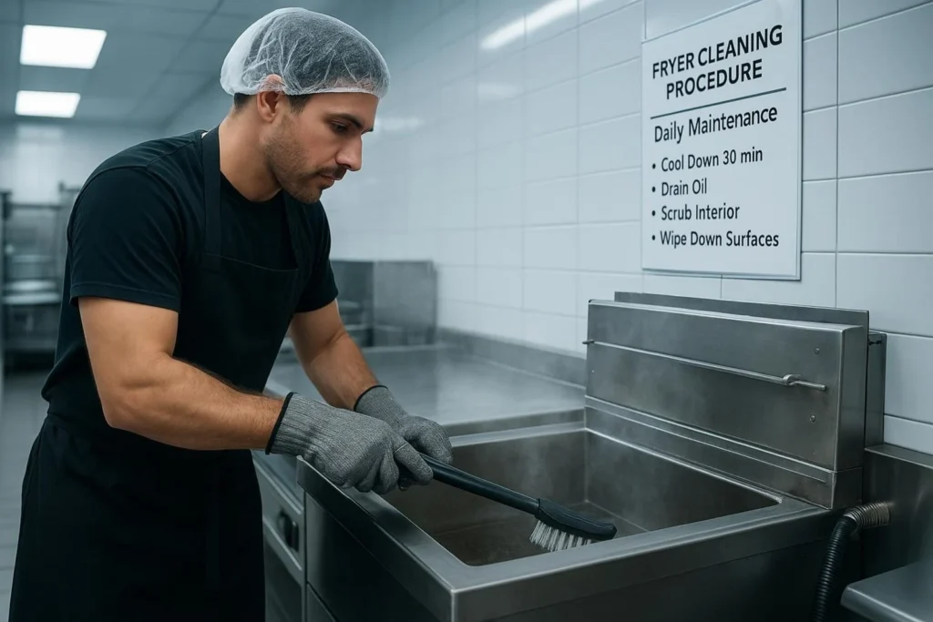 A steady daily cleaning routine is the best way to protect your fryer investment. At the end of each night, drain the fryer and scrub the vat to remove sticky, amber-colored buildup. This layer acts like insulation, makes the fryer work harder, and can eventually lead to breakdowns.